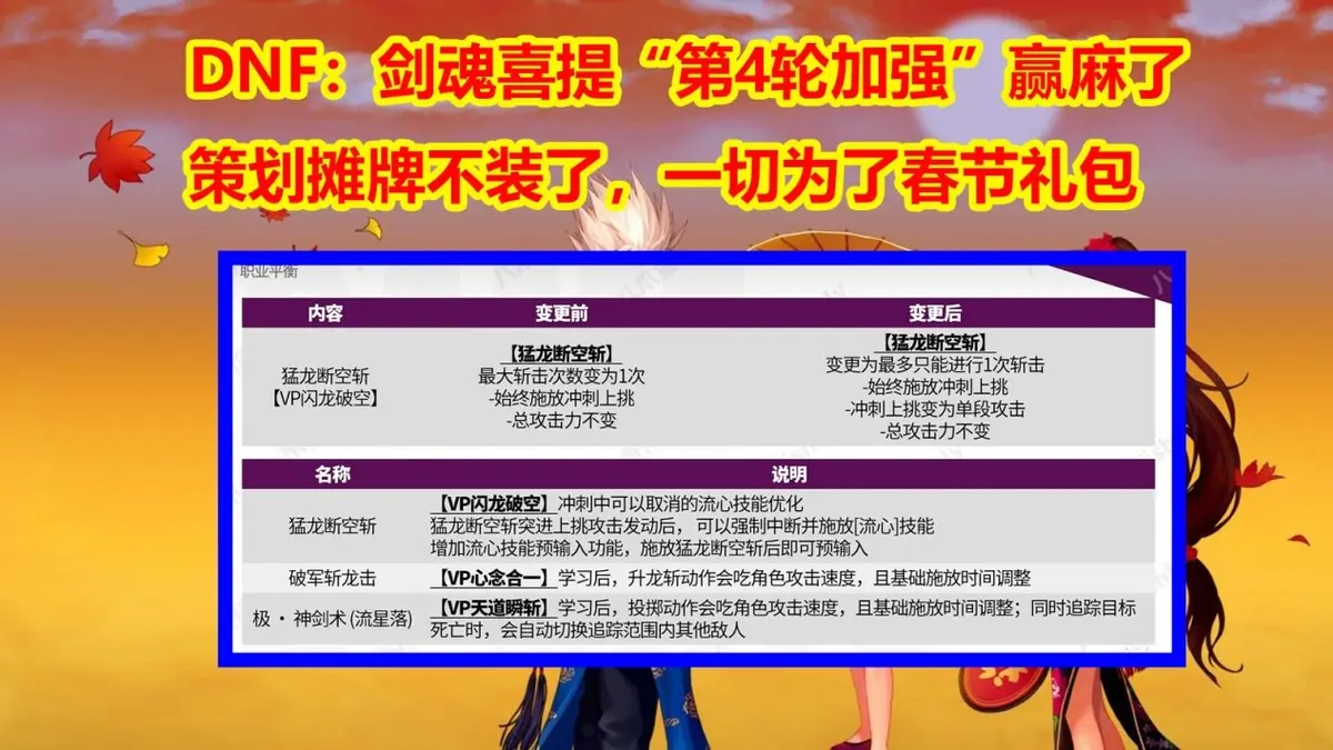 想不到2025年的最后两天,剑魂哥又加强了!喜提今年的第四轮提升,而且该的都是非常实用的,真就是在春节版本,直接给人口基数最大的职业,给大主播送惊喜啊!难怪要提前氪金,这种合作很好嘛!我们就看下剑魂哥的第四次加强数据吧: