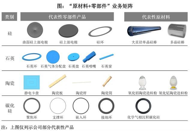 零部件产品是公司的收入基石。主要产品包括硅零部件(如曲面硅上部电极)、石英零部件(如气体分配盘)、碳化硅零部件(如CVD碳化硅环)、陶瓷零部件和工程塑料零部件。这些产品主要应用于集成电路制造中的等离子体刻蚀、薄膜沉积等环节,以及显示面板制造中的刻蚀、薄膜沉积和蒸镀等工艺设备。