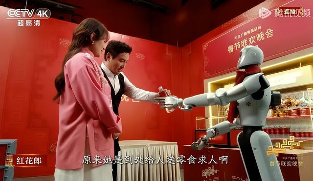 所以,在大年三十晚上,松延动力的机器人,在小品里给蔡明当“孙子”,撒娇卖萌,一口一声“奶奶”。银河通用的机器人,在微电影里给沈腾递水、叠衣服,成了“铁哥们”。宇树科技的机器人成群结队,打起醉拳,摔倒还能原地爬起。