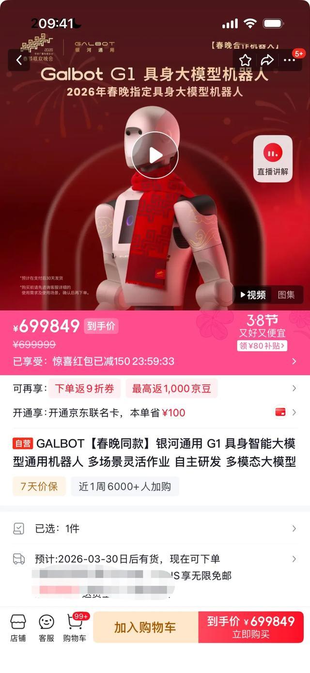 看几个数据。春晚开播两小时,京东机器人搜索量环比增长超300%,问询量增长460%,订单量增长150%。同时上架的包括“春晚同款”在内的很多机器人,几分钟内就被抢空。沈腾马丽节目里的银河通用机器人,近300台被加购,工厂甚至还加班赶工。哪怕你现在上京东看,还得等上一个月才有货。