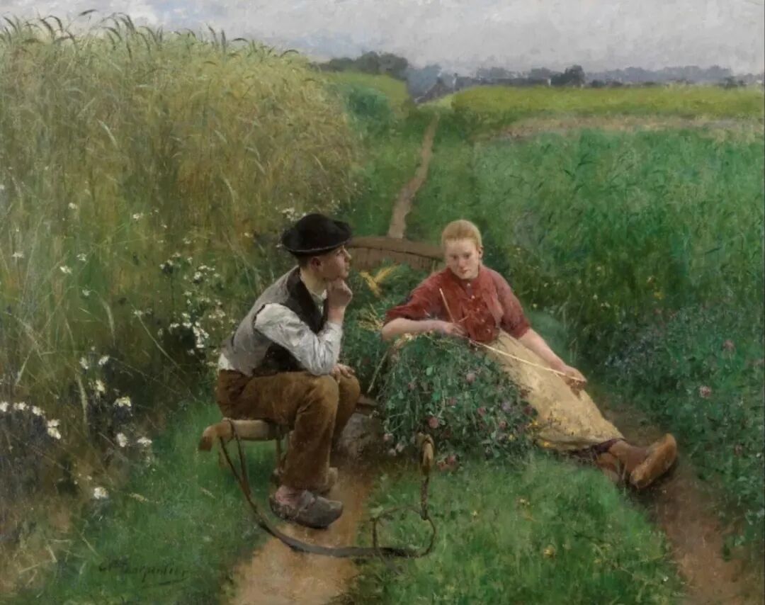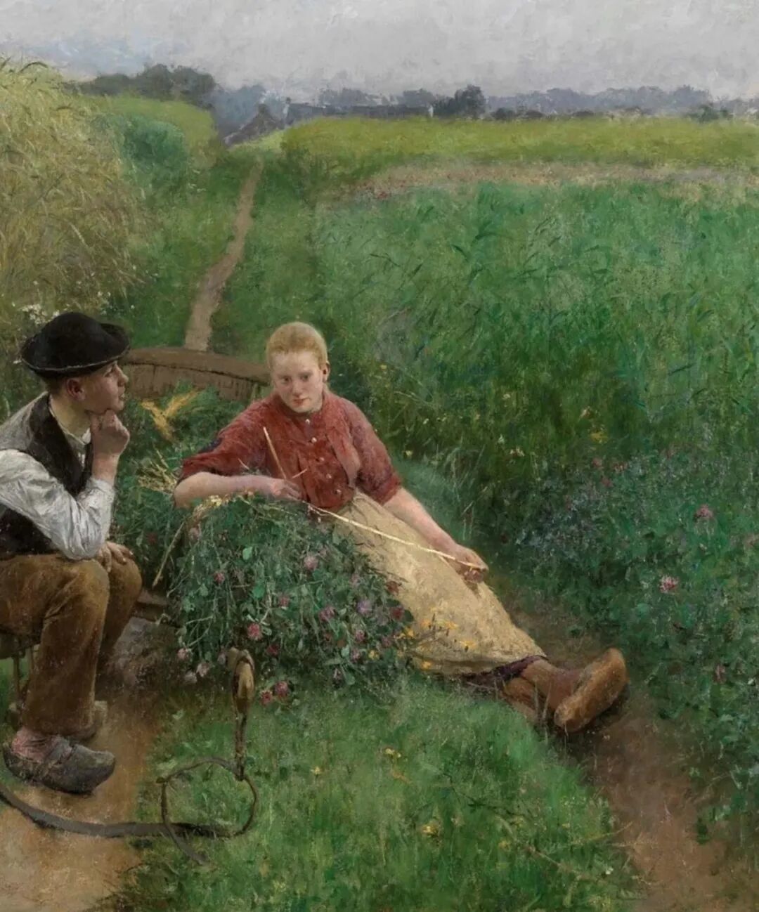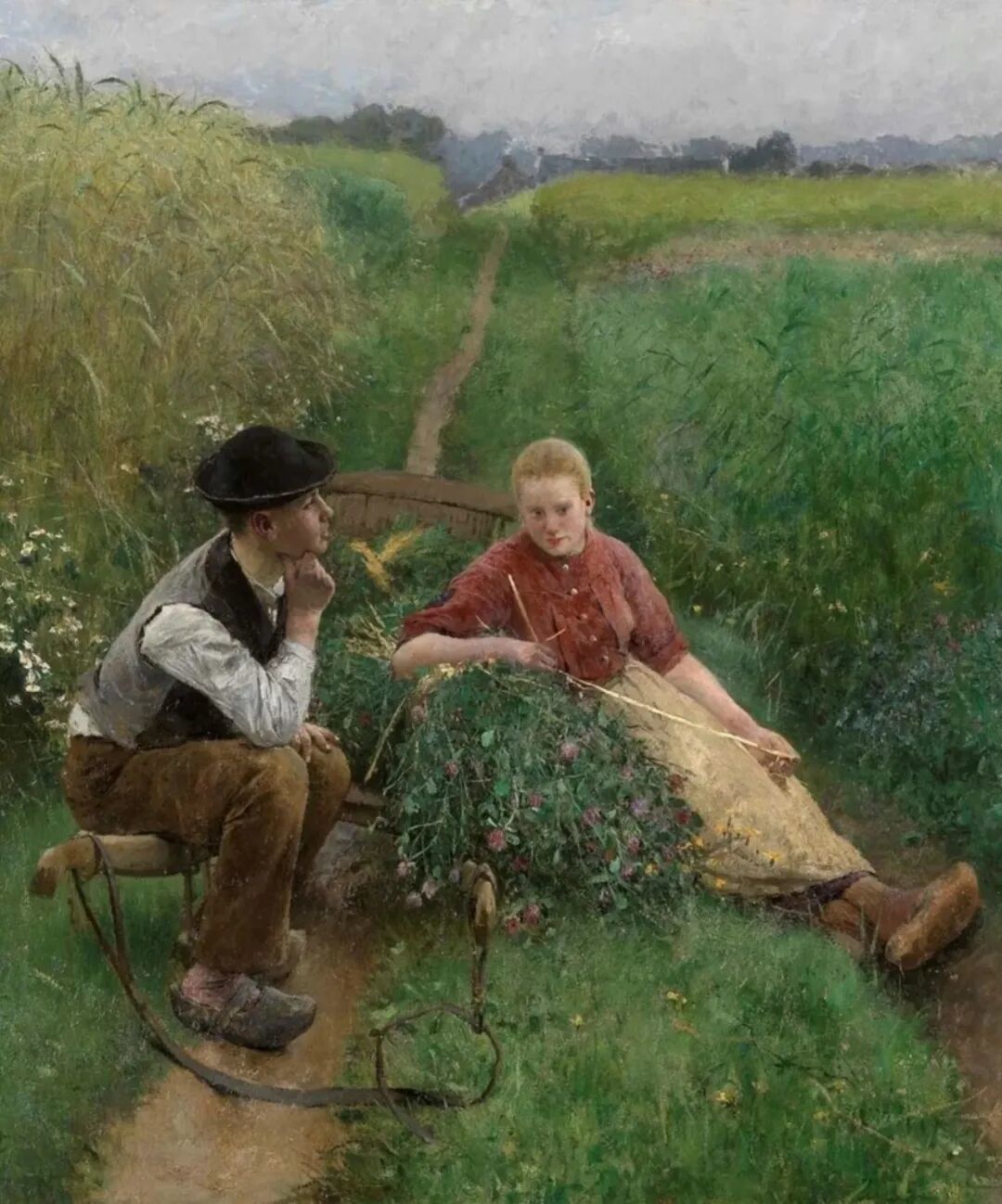 画面描绘了一对小情侣坐在蜿蜒的乡间小路上休憩的场景,他们的四周除了生意盎然的麦田、野草和夏花,根本谈不上有没有什么吸引人的景致。